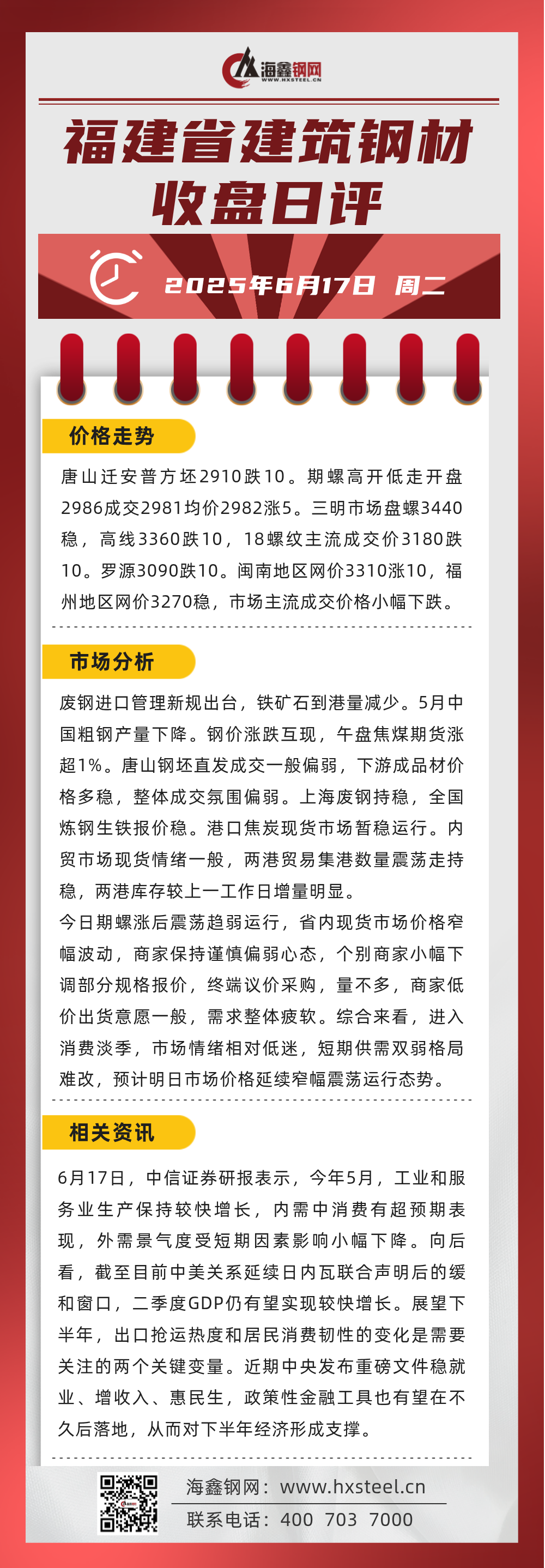 6月17日福建省內(nèi)建筑鋼材收盤日評(píng)